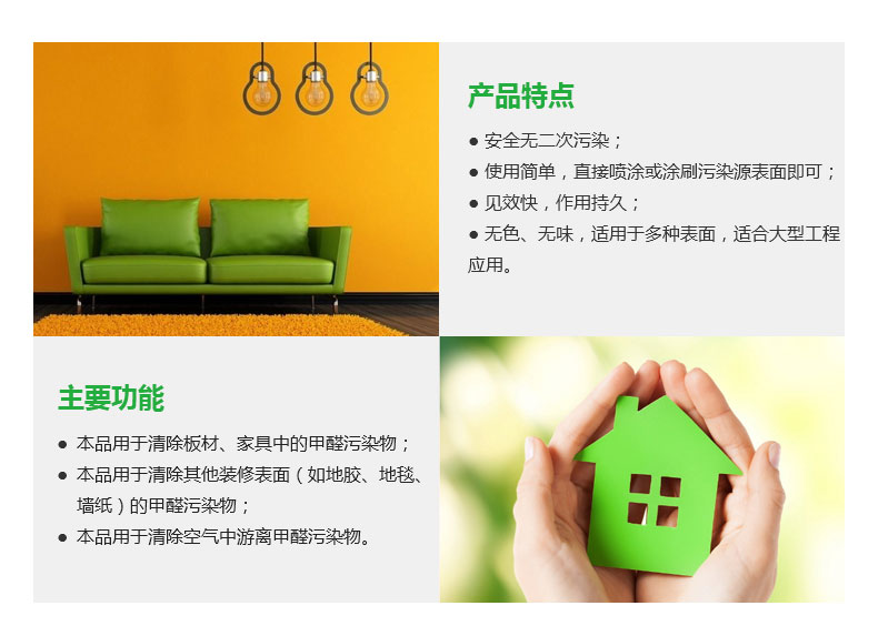 高效除醛劑是奧因環保公司推出的高效清除甲醛的產品。本品具有強滲透性,能夠持續與甲醛發生交聯反應,產品安全性好,適用多種基材表面,生成物無毒不腐蝕,適合大型工程應用。