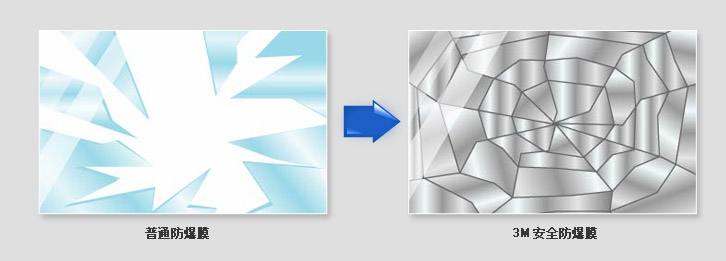 3M安全防爆膜是3M玻璃膜的一種,貼附在玻璃表面上,能在不改變玻璃外觀的情況下,在隔熱的同時增加玻璃的安全性。